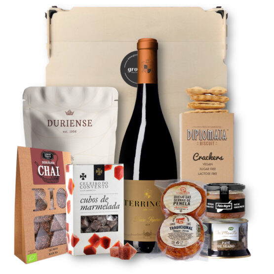 O Cabaz Cortesia apresenta-se numa caixa de madeira delicada e leve. Fomos buscar um vinho DOC Douro Tinto, produzido pela Quinta da Terrincha, situada no Vale da Vilariça, na sub-região Douro Superior. E acompanhamo-lo com umas crackers Diplomata, um queijo de mistura, biscoitos de vinho e canela, um chá em saquetas, cubos de marmelada e finalmente 2 patés de caça.
