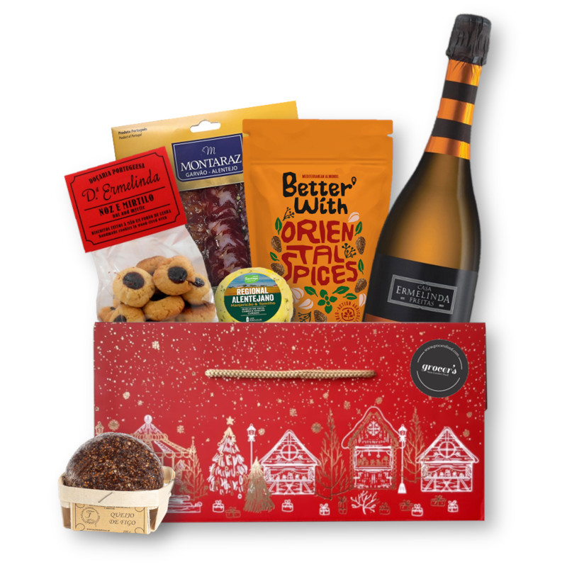 O espumante Ermelinda Freitas convida ao brinde, os biscoitos artesanais e o queijo de figo lembram as receitas de família, enquanto o porco preto fatiado, o queijo de mistura e as amêndoas caramelizadas criam um percurso de sabores que faz querer ficar à mesa mais tempo. Tudo isto embalado numa caixa natalícia que transmite cuidado e celebra a época com elegância.