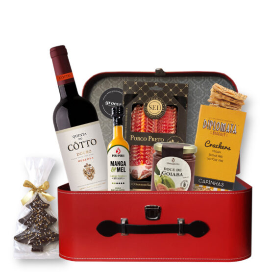 Este cabaz leva uma mala de cartão vermelha 33x21x11 cm, Cotto Reserva Douro Tinto 75cl, Doce de Goiaba 220g Quinta do Coro, Molho Suave de manga e Mel 50ml Piri-piri, uma Árvore de Natal de chocolate de Leite 80g Annobon, Paio de Porco Preto Fatiado 100g Sel, e umas Crackers Diplomata 125g. Cuidadosamente embalados numa mala de cartão vermelha 33*21*11cm decorada com fita em tecido colorido.